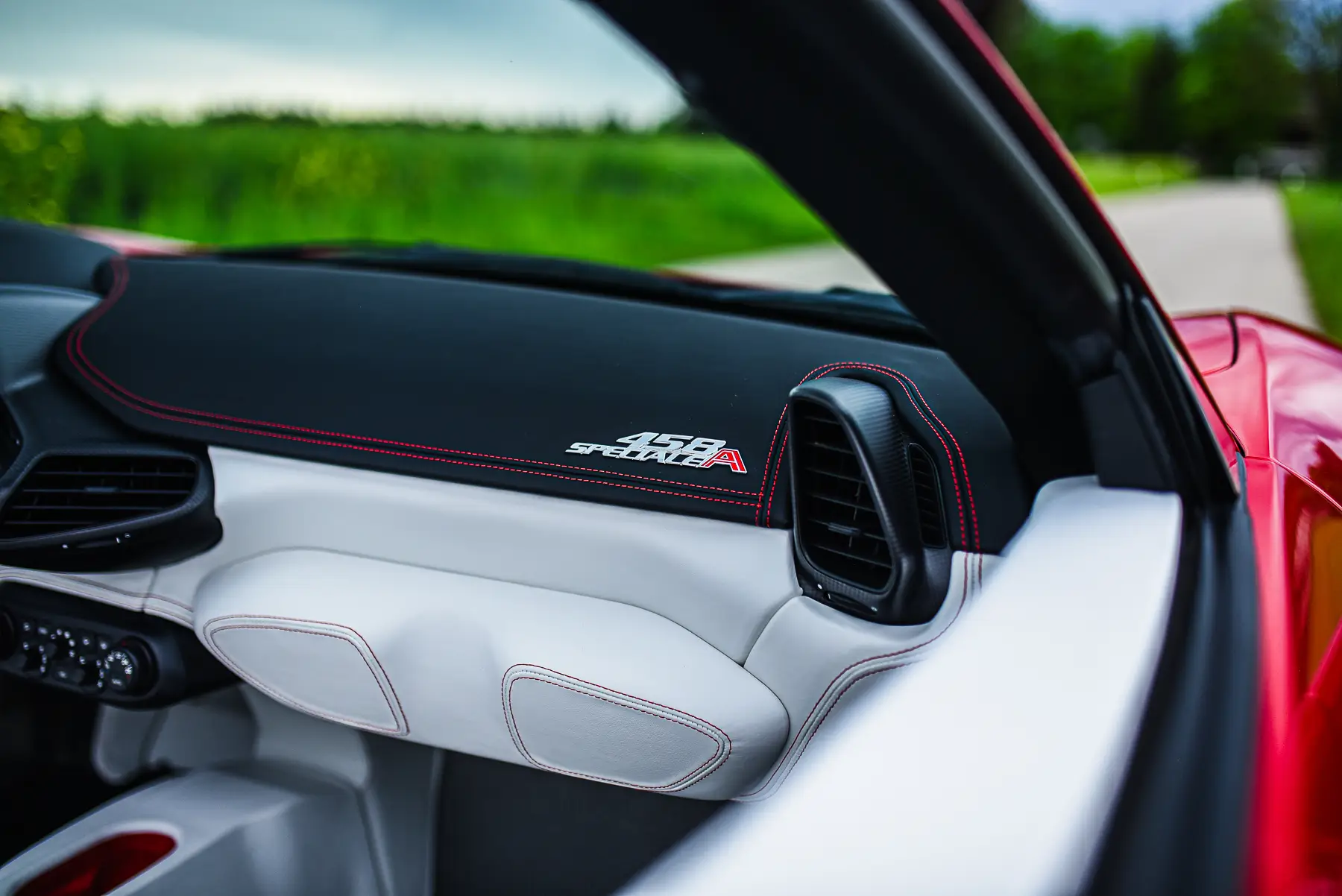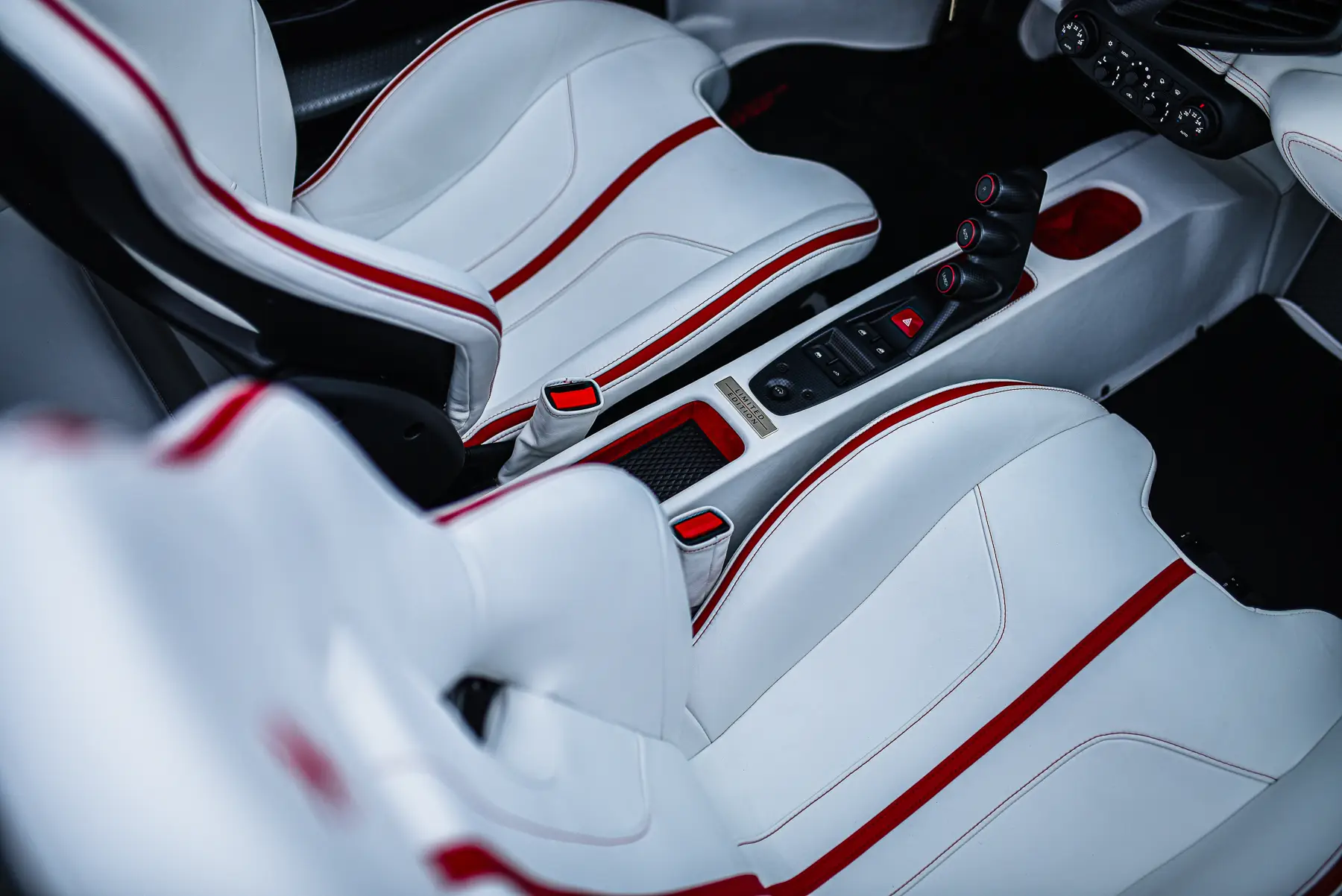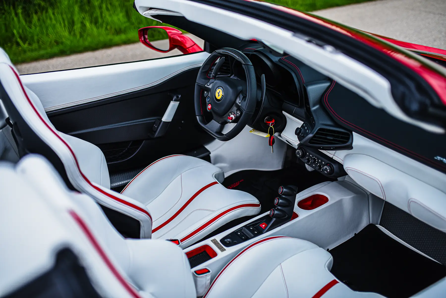 Our Speciale Aperta was delivered new through official dealer Riller & Schnauck GmbH to its first owner, resident in Paris, in July 2015. The 458 was specified new in the stunning color of Rosso Fuoco with a Grigio Silverstone livery. The interior was finished in Cuio and later on entrusted to Zanasi in Italy for a re-trim in white leather with red contrasting stripes and stitching. Zanasi are responsible for painting Ferrari’s preferred supplier for all bespoke paint and interior finishes. The Speciale was optioned with all available carbon fiber options in matt finish, making this example one of the highest specification Speciale Aperta’s and thus one of the most expensive.