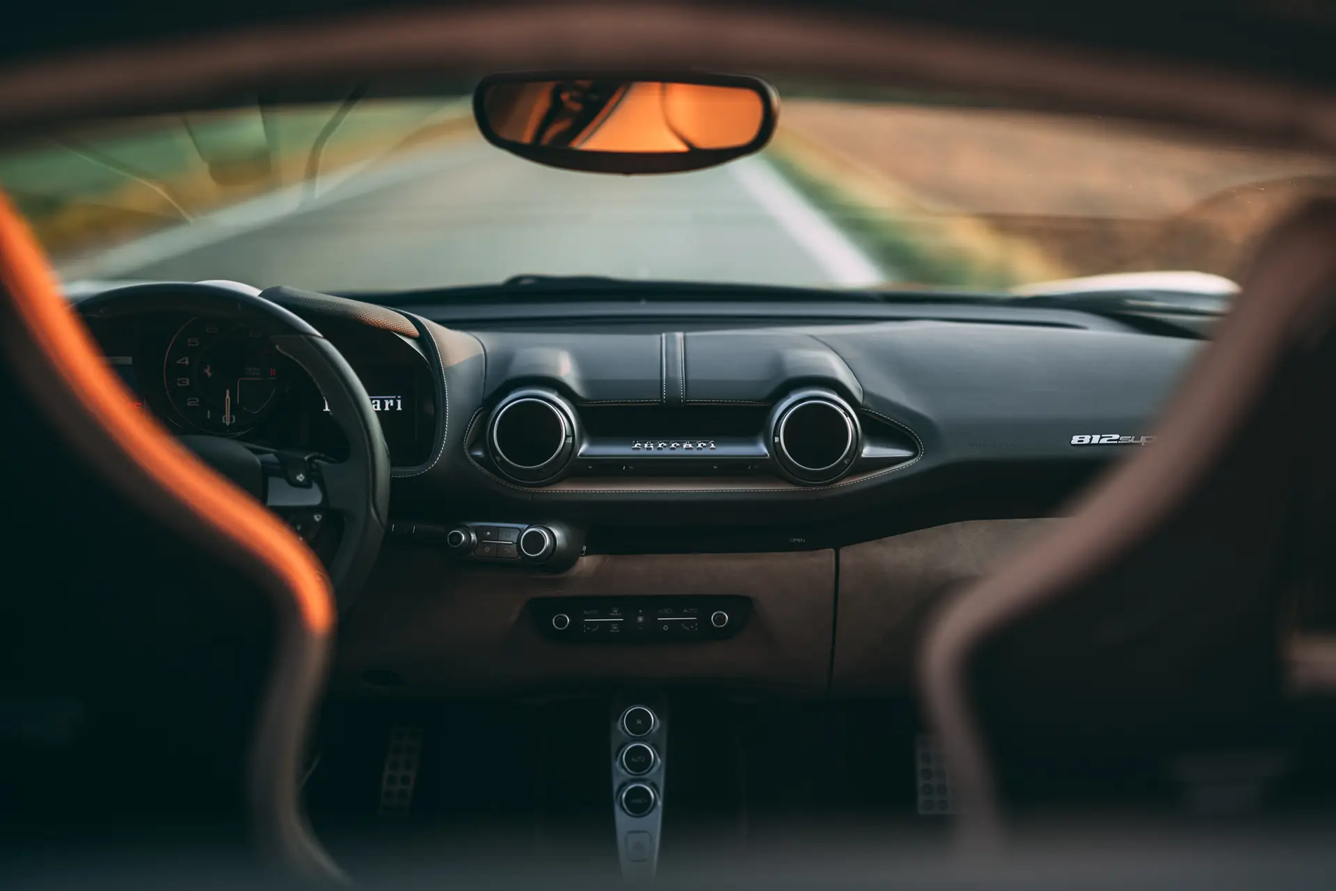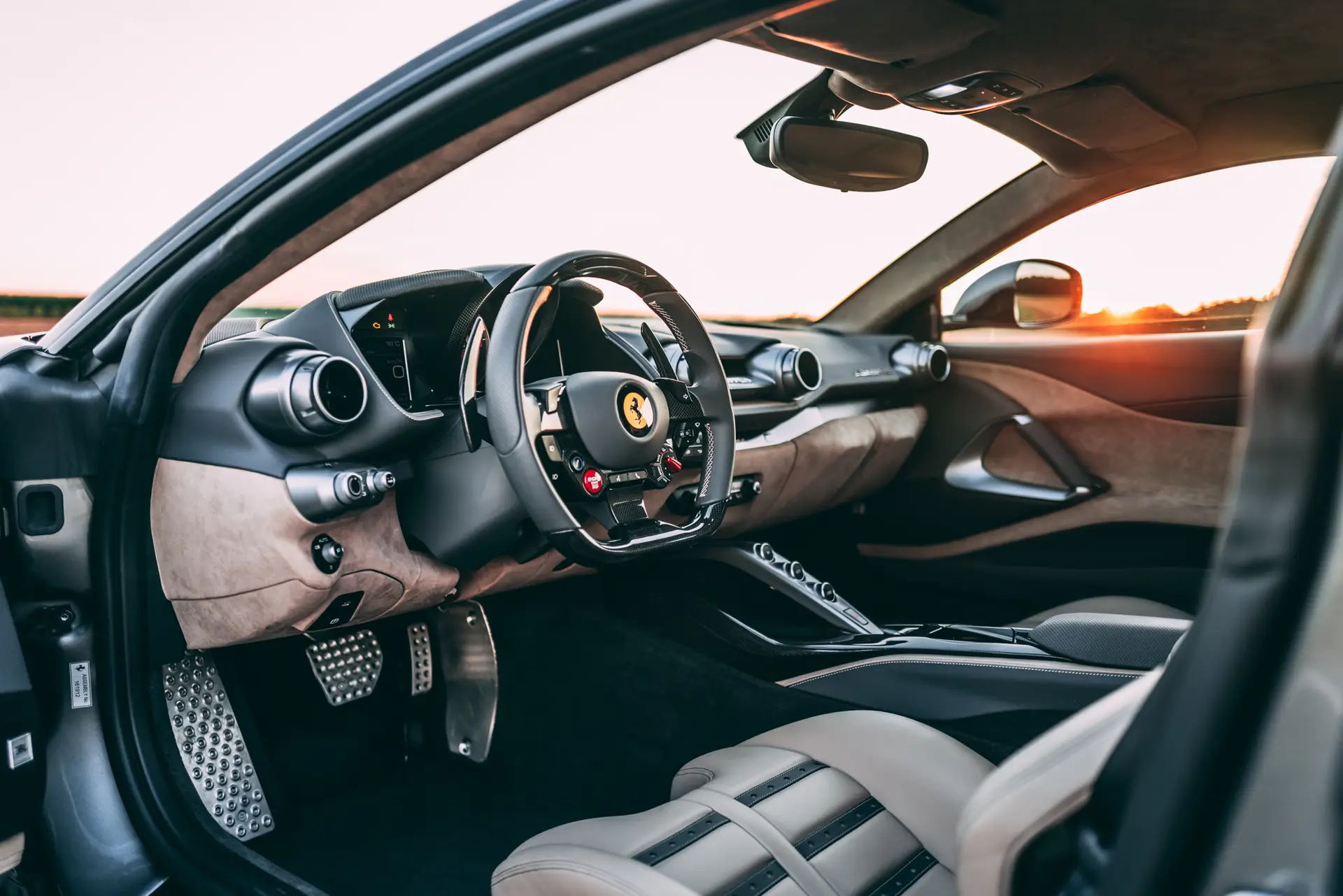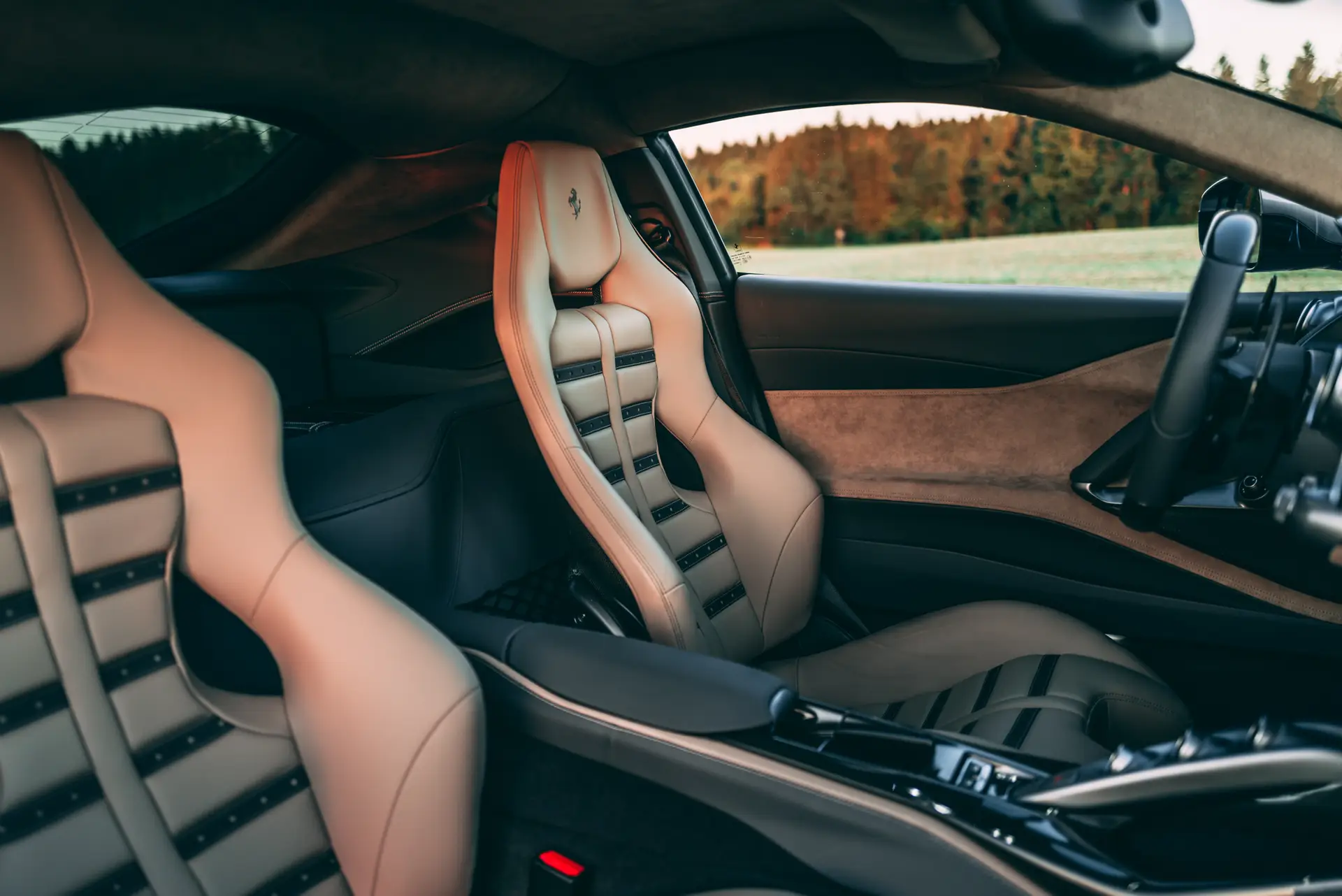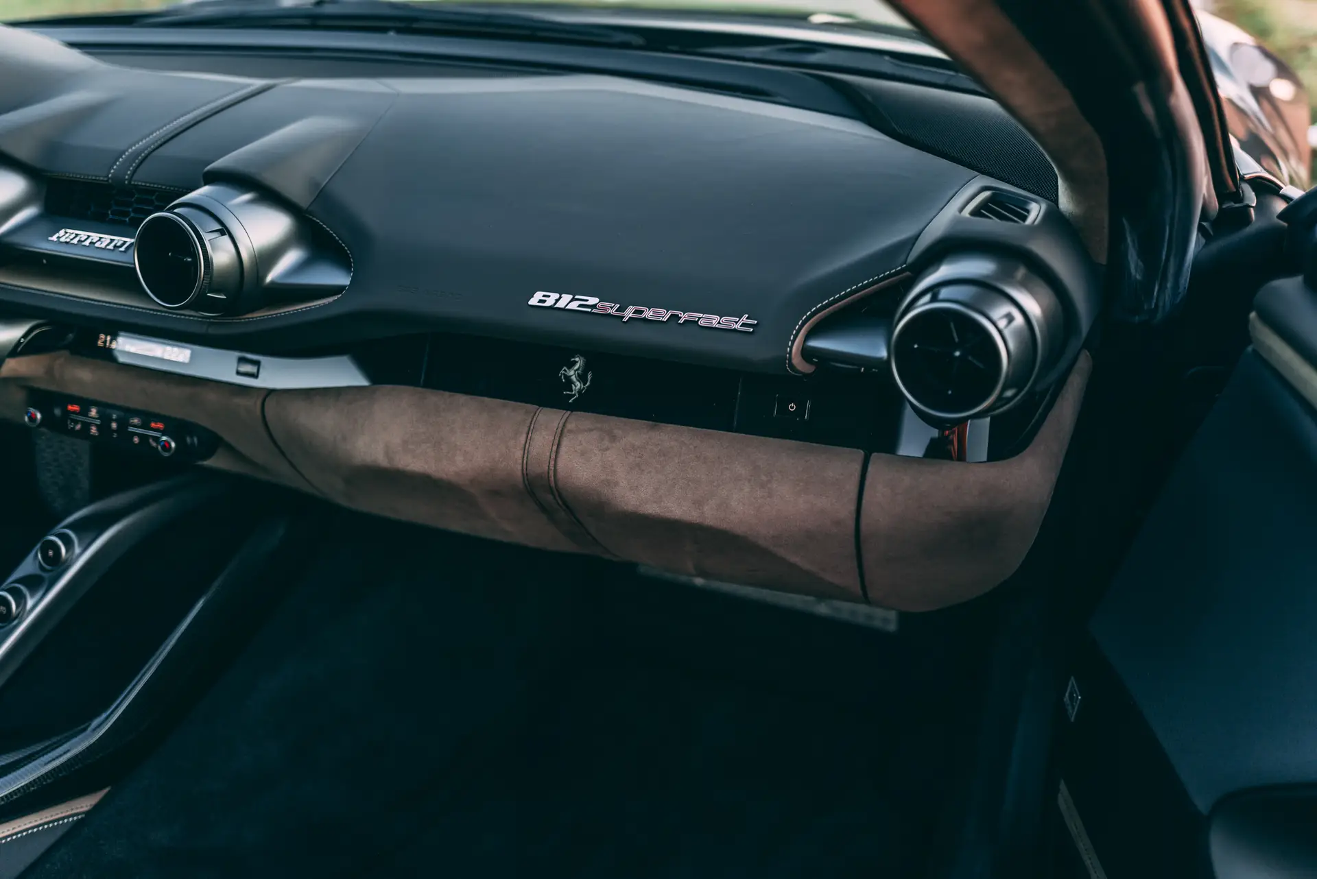 The example we have here is one of the nicest specifications we have ever seen on an 812. Delivered new in December of 2018 through Francorchamps Motors Brussels S.A. to a German resident in Saarbrücken, the car was specified in the historic color Grigio Ferro over a Tortora leather and alcantara interior. The exterior color marries extremely well with the interior colors and materials, every detail was kept elegant yet sophisticated. The owner opted for silver wheels with black brake calipers, and subtle touches of Carbon fibre. The seats are exquisit Daytona-style bucket seats, enhancing the whole appearance of the interior. The specification is absolutely well thought out, one of the very best. The car has had three services since delivery, with the last service being carried out in November 2021. The odometer shows a mere 8,500 km. The owner even opted for a warranty extension fort he 4th and 5th year, meaning this 812 is still under warranty until the end of 2023.