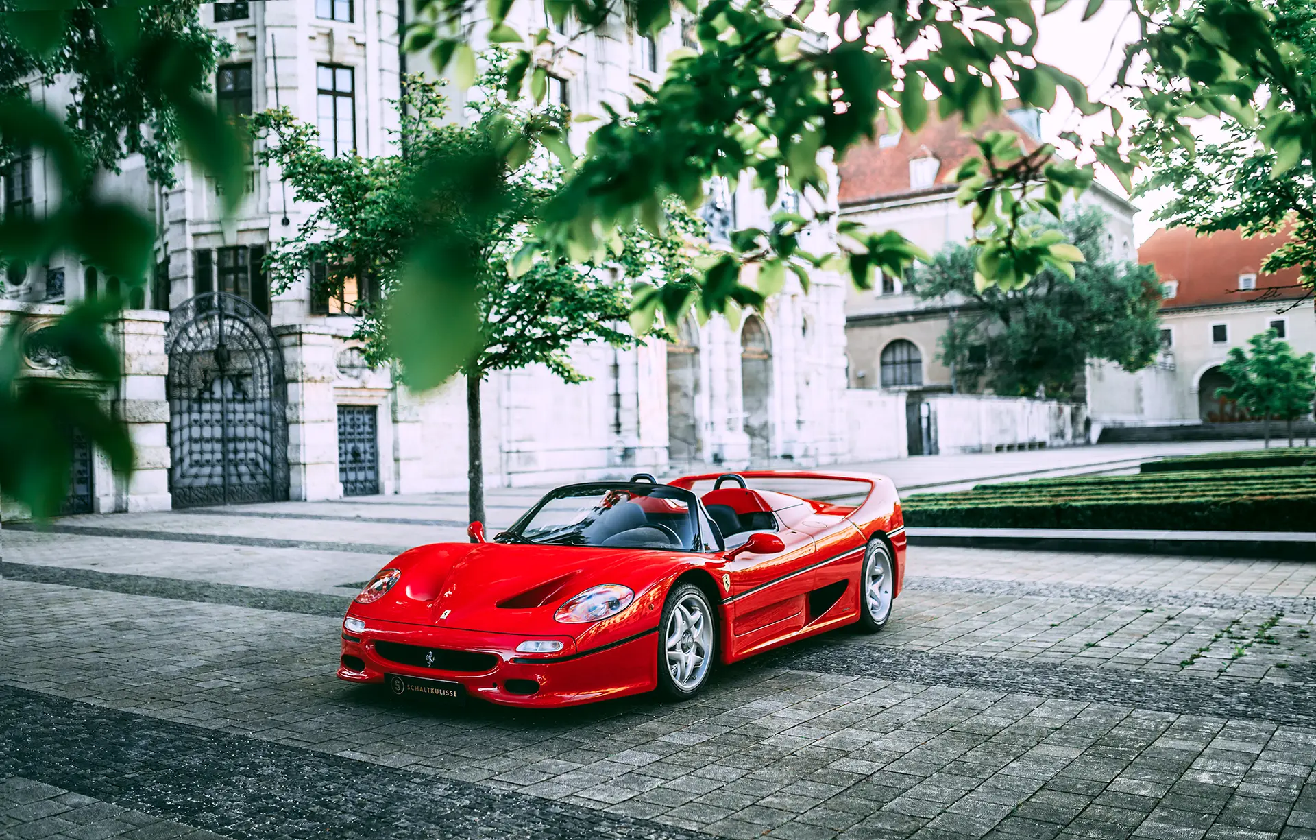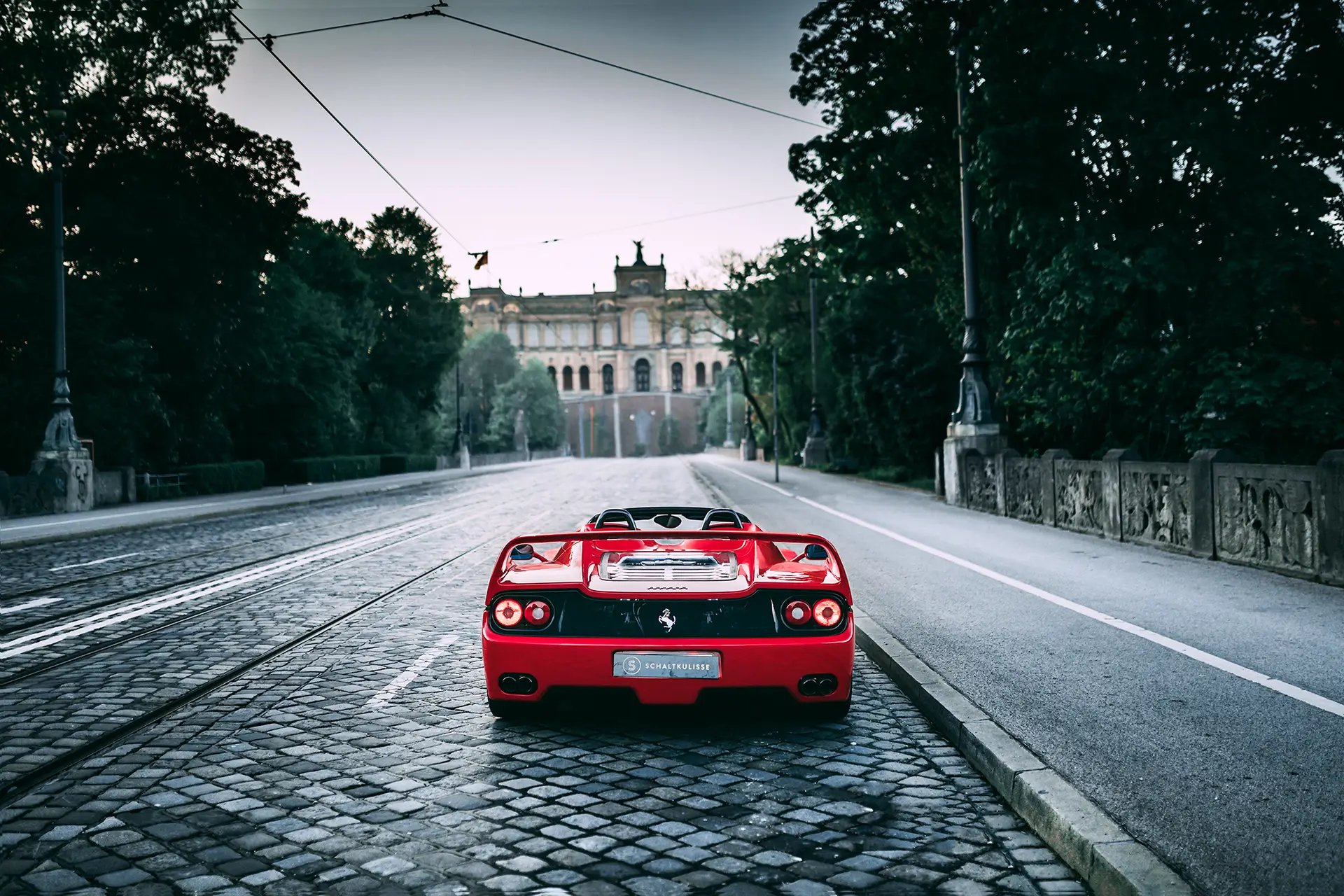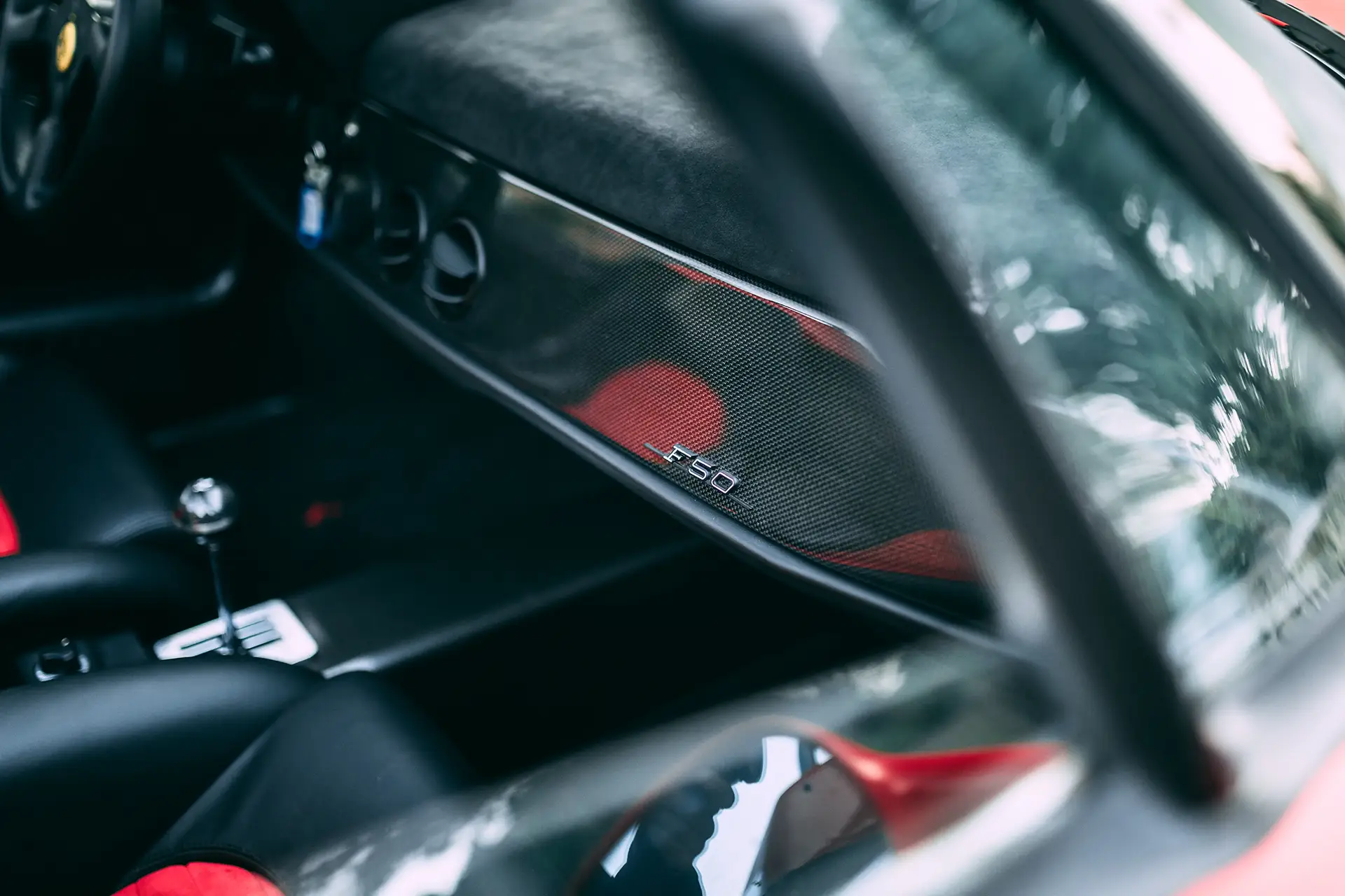 Our F50 in classic rosso corsa and black interior was first sold by the Autohaus Ulrich, Frankfurt, on 20.06.1996. After chassis #105081 had spent its early years in Germany with its first owner, it found its way to England. From 2005, it was regularly serviced by Graypaul, the official Ferrari dealer in Nottingham. Many receipts document the extent of the regular maintenance work. In 2016, the car returned to Germany, as part of a renowned collection of historic and modern Ferraris of different periods. The new owner will be able to enjoy going some distance with this icon of the 1990s – without fear of immediately depreciating its value, for it currently has just 22 440 km on the speedometer. The low mileage and meticulous care from previous owners (particularly the most recent) mean it enjoys an exceptional overall condition. The finish is beautifully kept, its evidently carbon structure protected by a transparent PPF stone splinter protection film. The original vehicle document folder, logbook and a Classic Ferrari Certificate are supplied, as are the complete set of keys and the hardtop box.