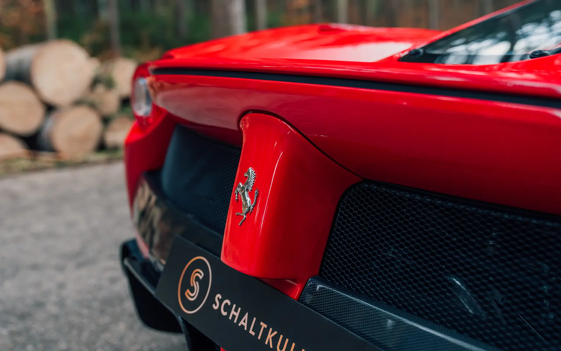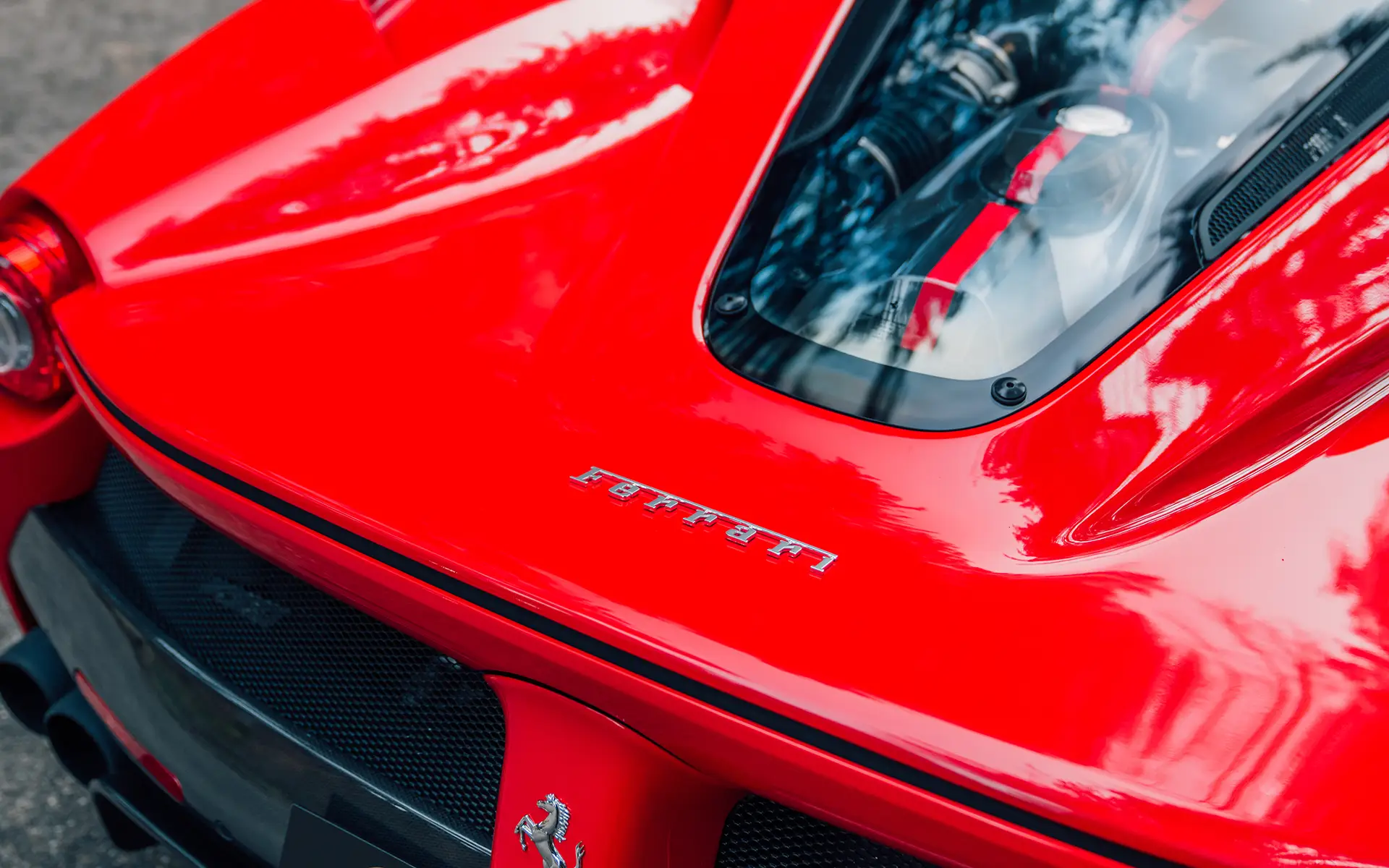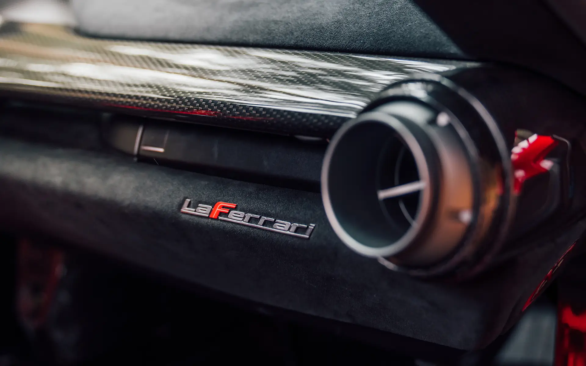Our car is a German-delivery car that was supplied new to Maranello Motors in Cologne in March 2014. It was specified by its first German caretaker in Rosso Corsa over a Nero roof, a full black Alcantara interior with red stitching, and with otherwise every single possible carbon fibre option. The black five-spoke wheels together with the red brake calipers make for a coherant and simply striking specification. The first owner registered the LaFerrari in Germany and accumulated around 4,500 km on the clock before deciding to sell it to the next German owner in September 2022. At the time of acquiring the car, the current owner decided to book the all-important Ferrari Hybrid Battery Warranty, which covers any problem with the battery for the next two years. Under the ownership of its second owner, the LaFerrari drove further 250 km, making the current total mileage just below 4,750 km.