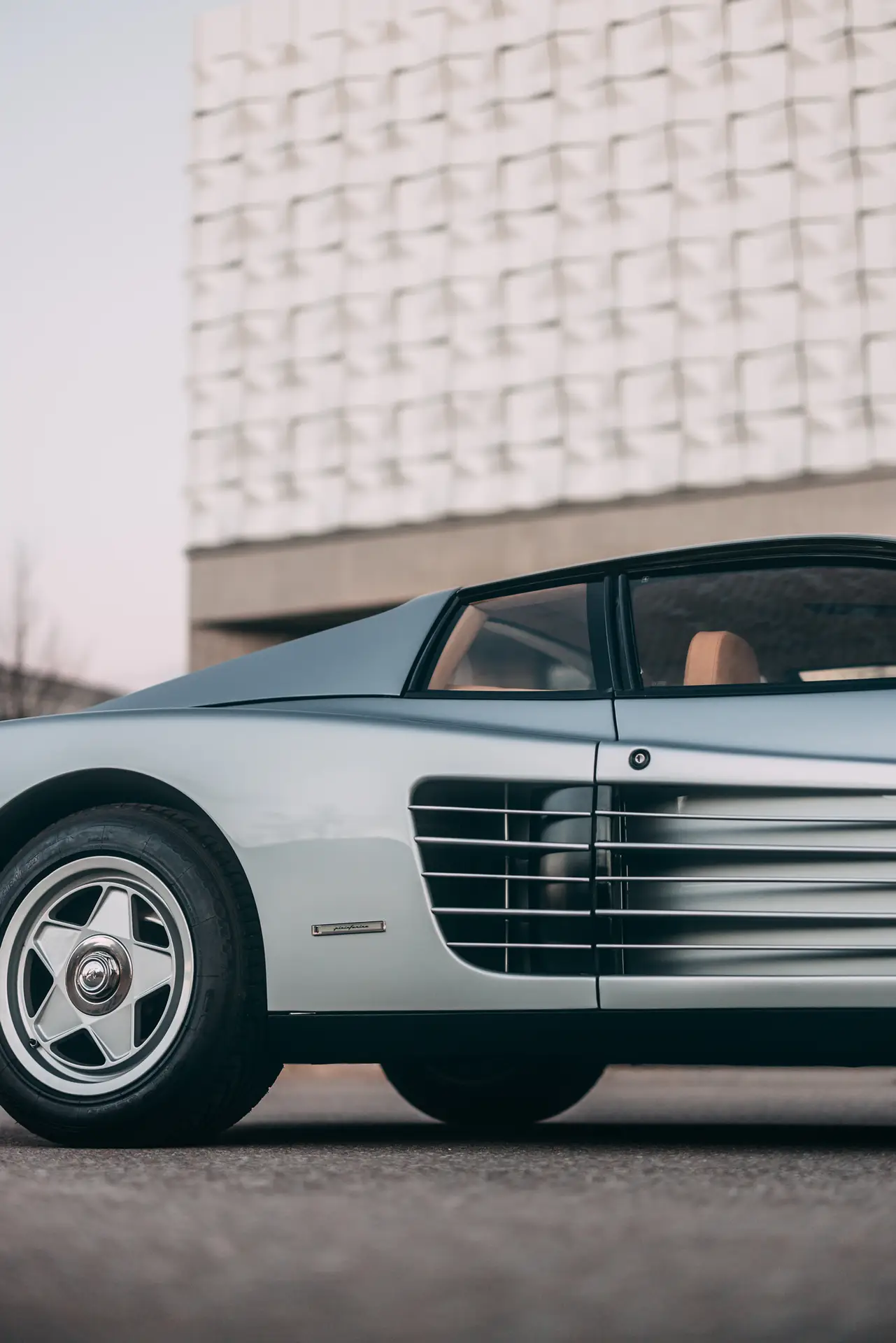 Introduced to the public at the Paris Motor Show in 1984, the Testarossa was an instant hit, thanks to its smooth, creamy flat-12 engine, and a unique angular design signed by Pininfarina. The success of Ferrari’s new flagship at the time meant that for the first time in its history, the company’s production numbers for the year 1987 exceeded the 1,000 units mark. More than thirty years later, the Testarossa is still an icon among car enthusiasts and instantly recognisable as a symbol of 1980s decadence and excess. Between 1984 and 1991, 7,177 Testarossa’s left the factory, excluding the later 512TR and 512M iterations. Within this relatively large production run, the so called ‘Monodado’ or ‘Single Bolt’, characterised by its center-lock magnesium wheels and two side mirrors, is one of the most desirable and rarest variants.