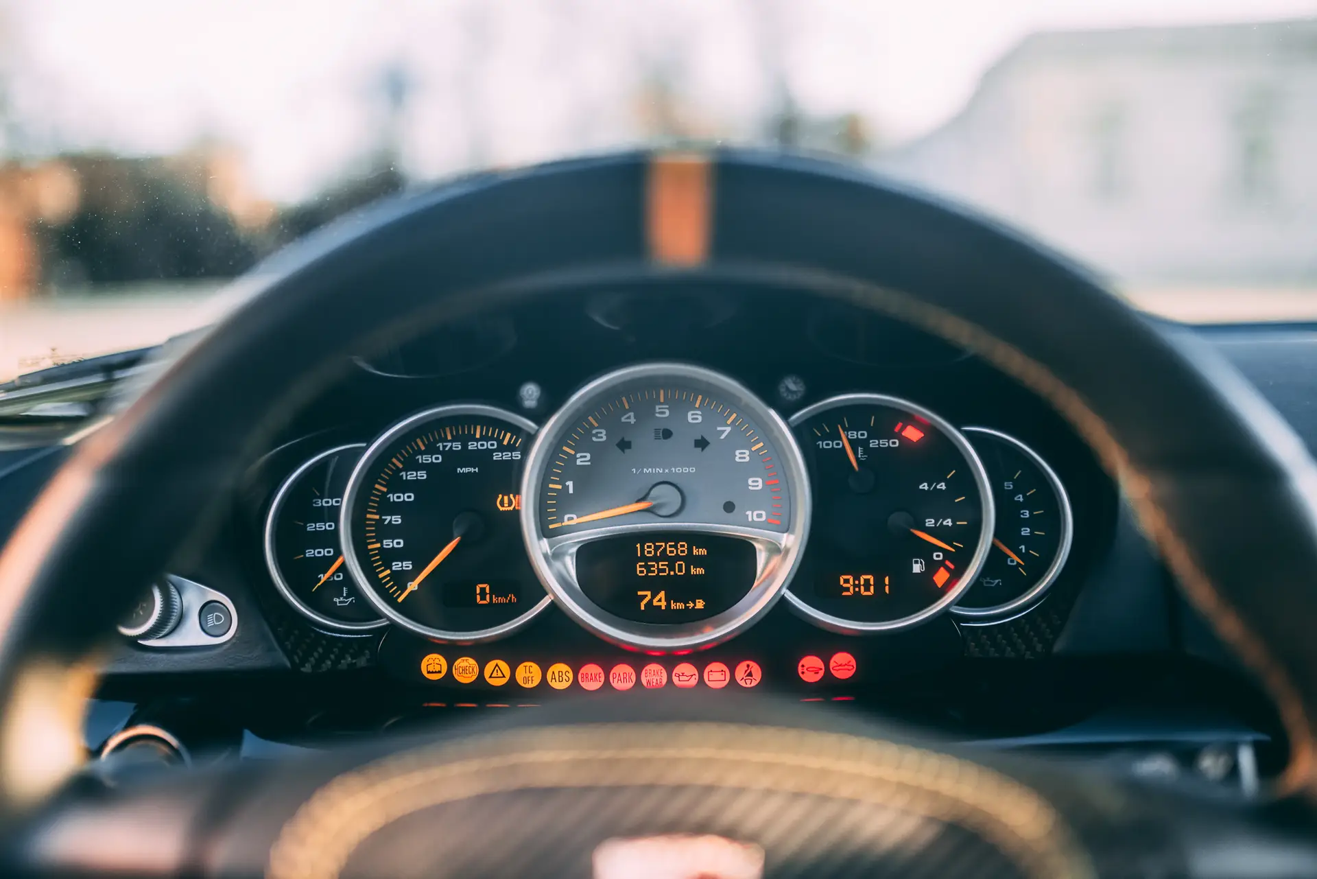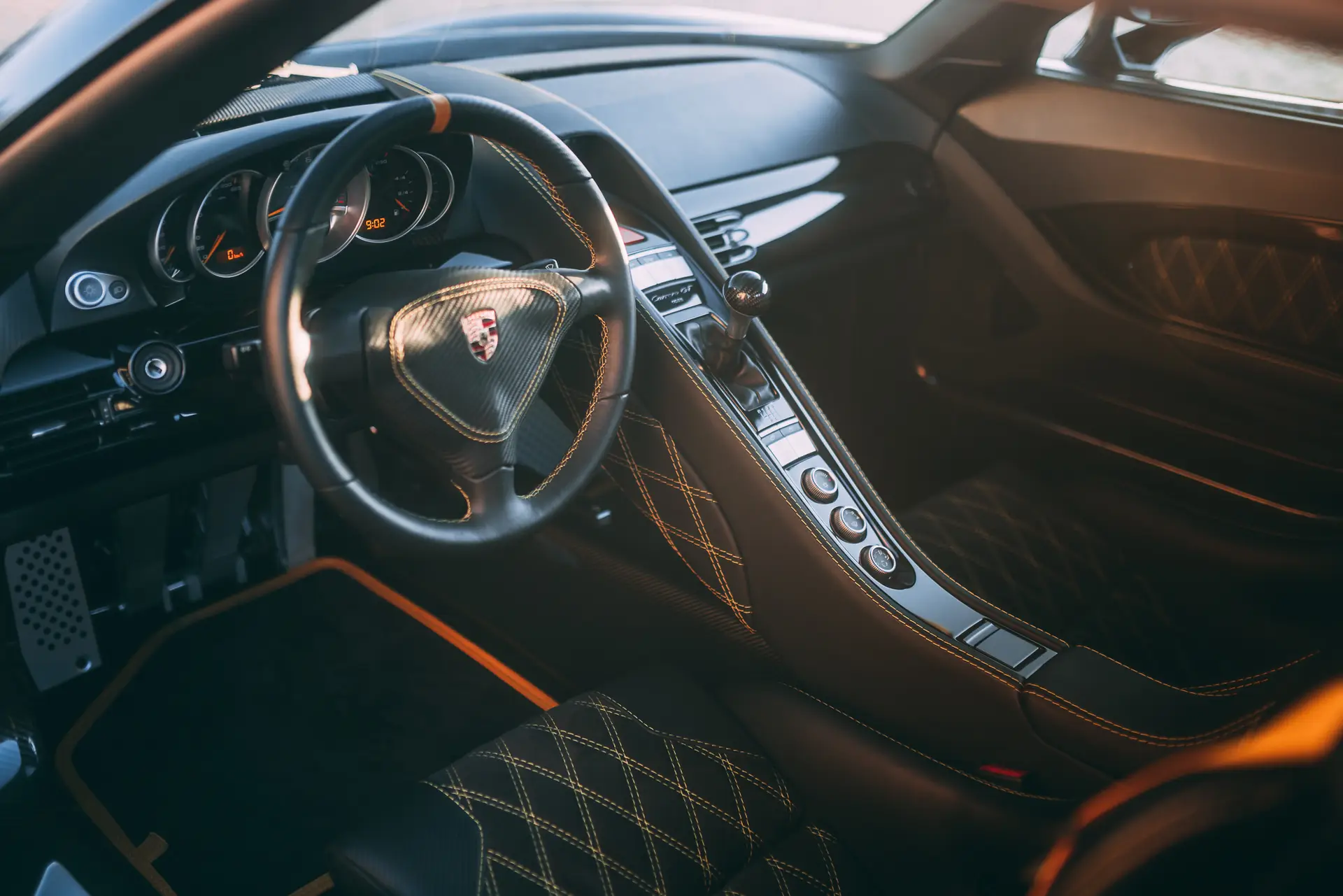 Under the ownership of Marian Gaborik, the car underwent a major service at Porsche Wien-Liesing in May 2010 for over 10,000 EUR. At the time of the service, the odometer displayed 7,563 km. BIMMO s.r.o. took the car to Porsche Wien-Liesing for a minor service in June 2013 at 15,411 km. In the same year, the interior was completely retrimmed in yellow diamond stitching and black leather by the company Carlex Design. Under German ownership, the Carrera GT was treated to a major service including new Michelin Pilot Super Sport tires in September 2020 at Porsche Zentrum Kassel in Germany. A Porsche Approved 111 point-check was carried out at 18,747 km in January 2022 and shows that the clutch is in good condition and doesn’t show any anomalies. Its function was tested during a test drive and was judged normal. As of this time, the car displays less than 18,800 km. The carbon structure is visible throughout the body.