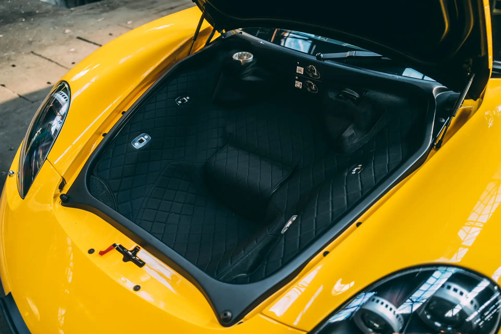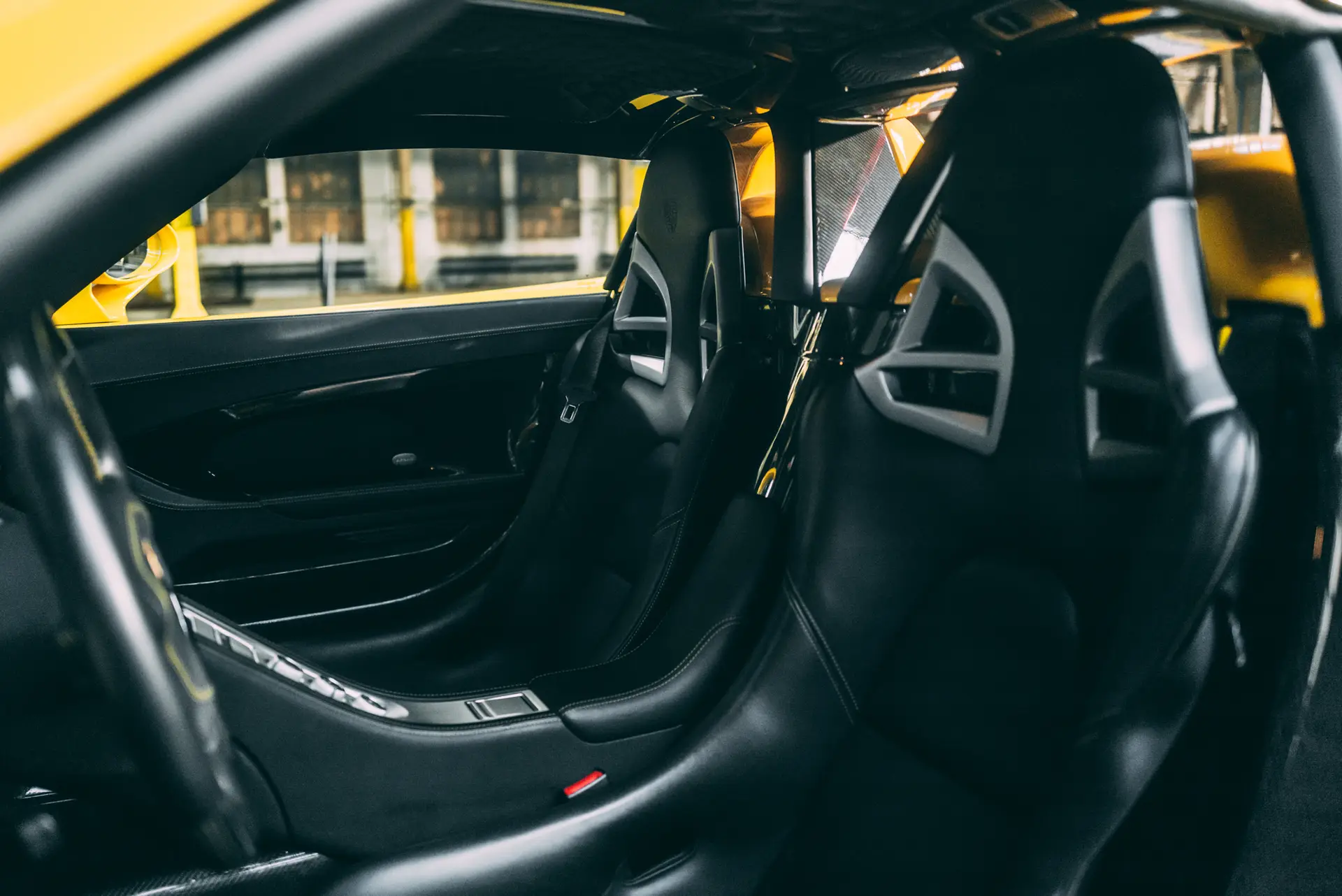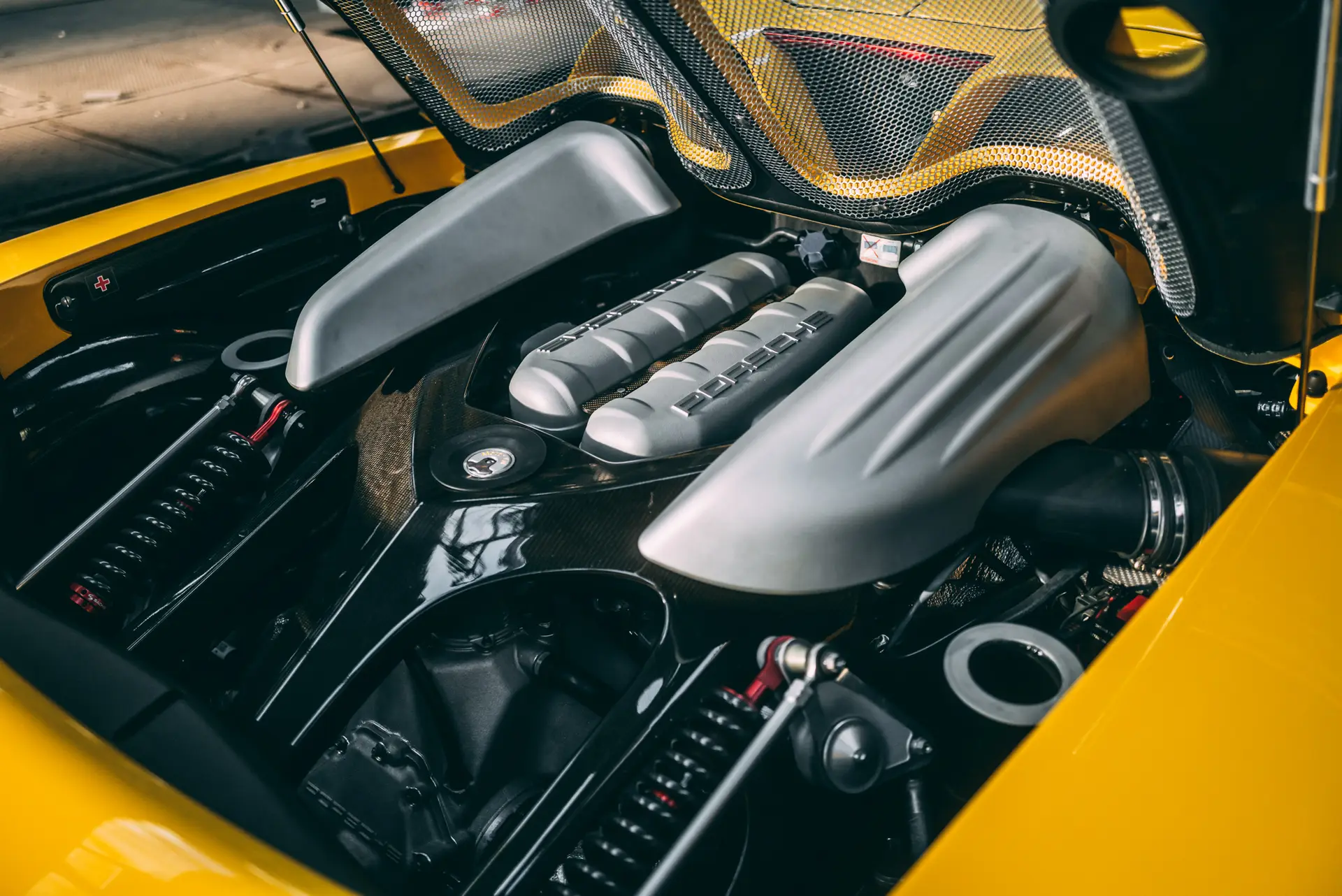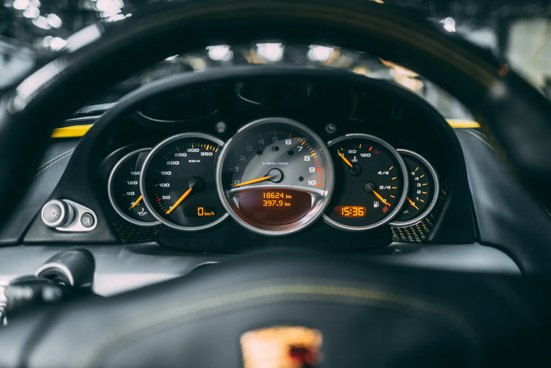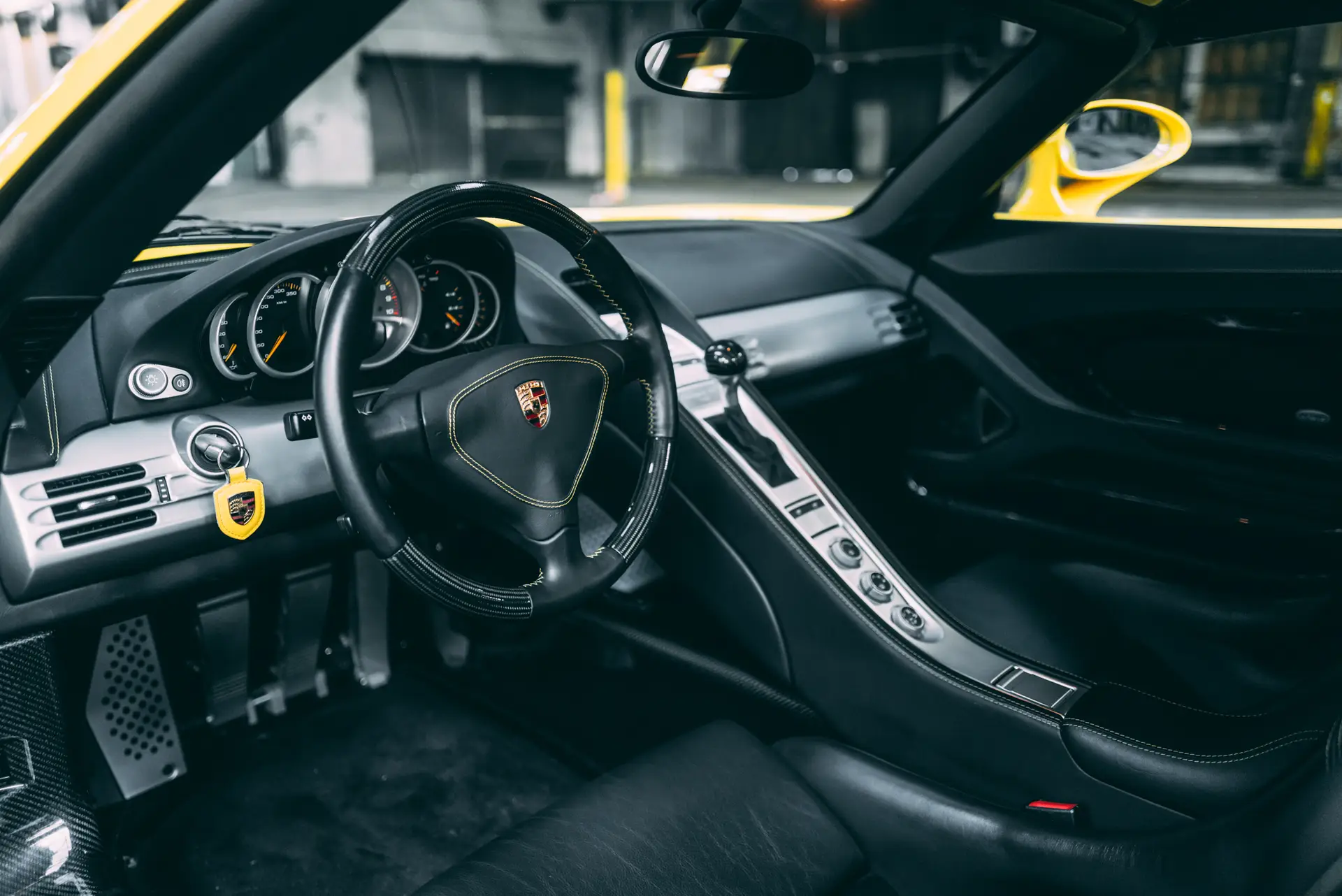 Our Carrera GT was delivered on the 14th of July 2006 through Porsche Zentrum Karlsruhe in Germany to its first and only German owner. Specified in the incredible color of Fayence Yellow which is the perfect fit to a Carrera GT, and quite rare, at only 89 cars made for the world in the color, of which 44 were made for the North American market and thus with the questionable side reflectors. The interior was kept simple but tasteful in black with yellow stitching and carbon fiber options. The Porsche was registered in its delivery city and driven sparingly over the years, totaling on 18,515km over 16 years, which amounts to less than 1,200km per year. No cost was spared in maintaining this Carrera GT, with a service book filled with services, fluid changes, and condition checks, all done either at the delivery Porsche Zentrum Karlsruhe or Porsche Zentrum Stuttgart just in front of the museum. The history of the car is limpid and clear and the mileage fully traceable. A stack full of invoices accompanies this marvel from Stuttgart, with as much as 21k Euros invested in 2018, as well as its full luggage set, and its original keys. It presents today in an almost new-car condition and is fully paint protected, with the carbon weave visible throughout.