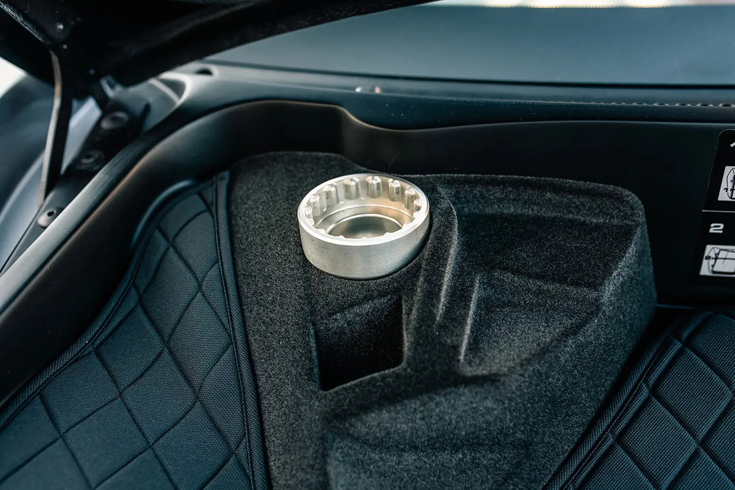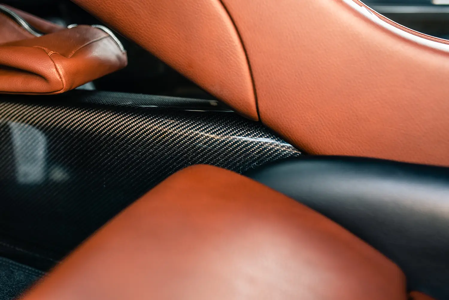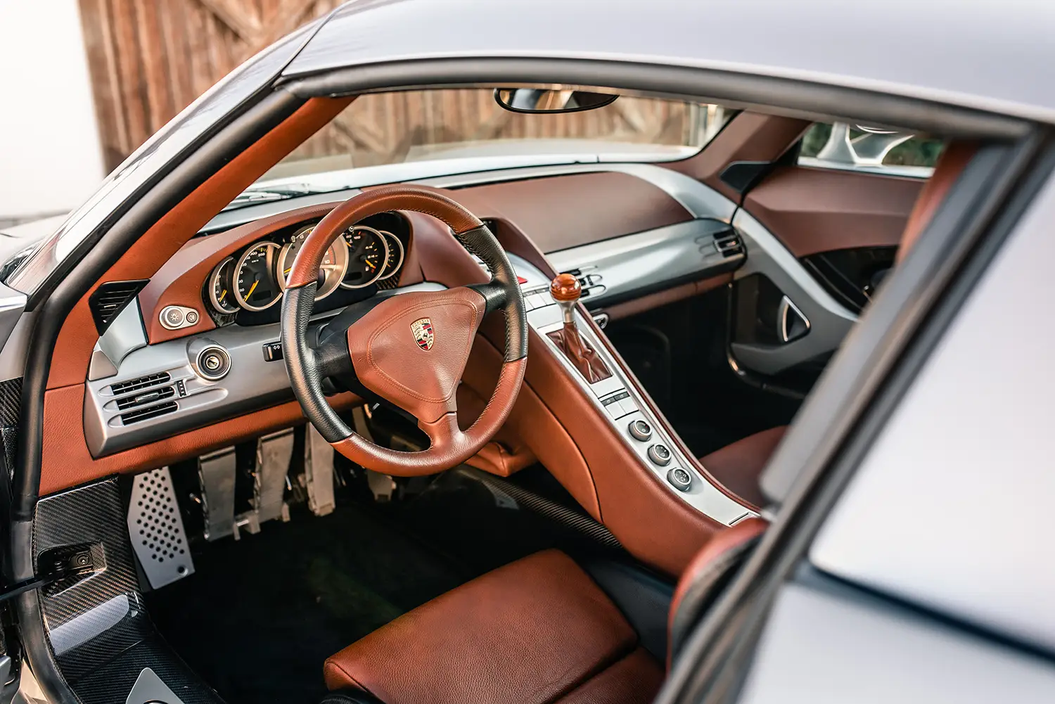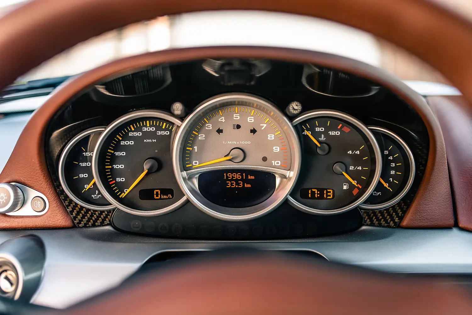 Our example in GT silver and Ascot brown interior was handed over to the first owner Dr. Wöllner. After Dr. Wöllner has driven the car approximately 14,000 km until 2012, he sold it to the second and last owner. Since then, only a further around 5,000 km have been driven. Quite a few Carrera GTs suffered various damage over the time due to their demanding character when driving the car competititve. In contrast, our vehicle is absolutely free of accidents and repaintings. The service history is tracable and was carried out regularly at Porsche. The last inspection was done at 19,677km in 2018. Today the speedometer of the Carrera GT shows 19,995 km and presents itself in a well-kept and absolutely original, genuine condition. The VAT is deductable in comparison to many vehicles. The ultimate driving machine for purists, accident-free and with an absolutely clear history, which would like to be driven even more kilometers in the future.